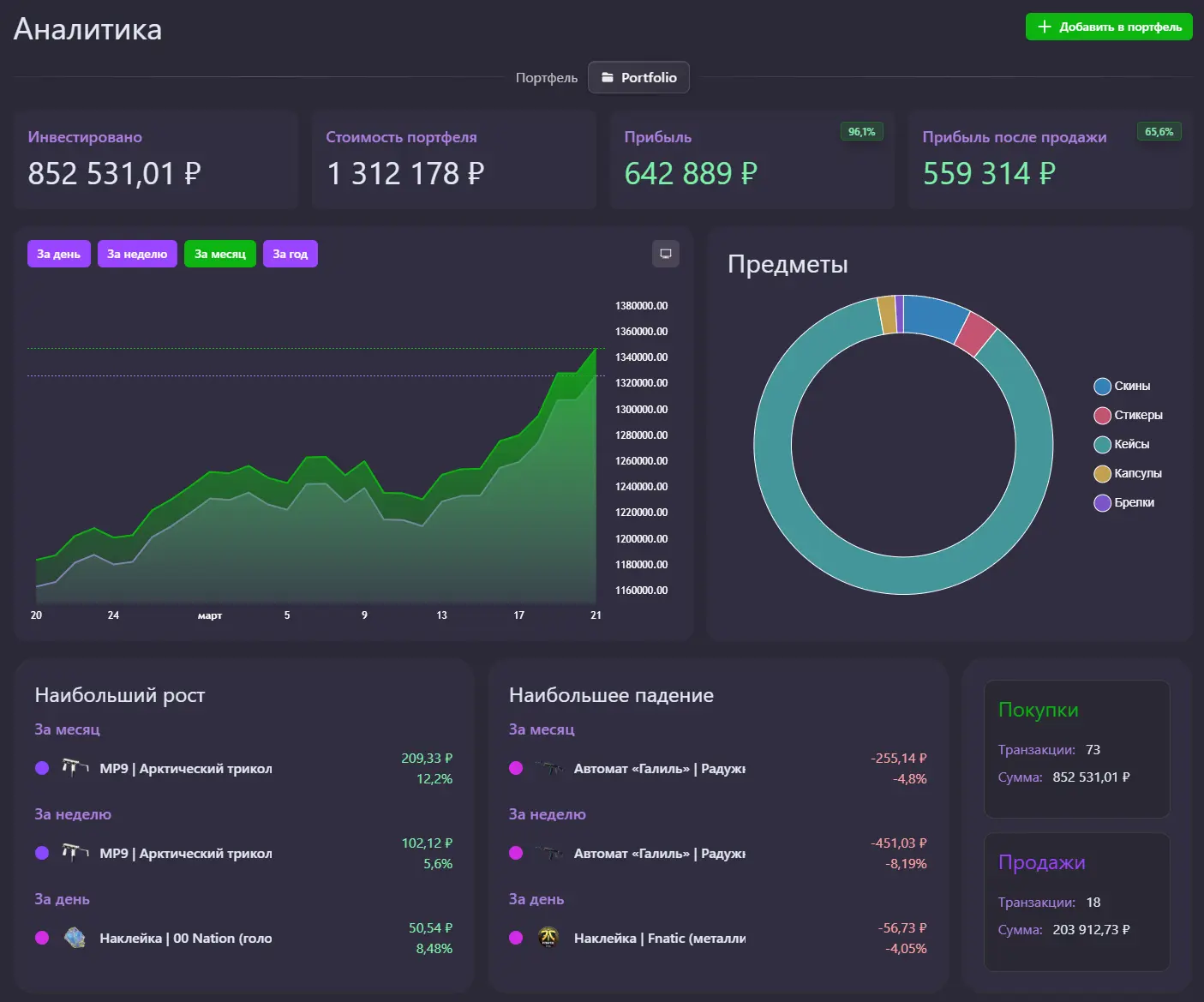 Смотрите графики изменения цены на каждый предмет. Анализируйте общую доходность портфеля, понимайте, какие активы растут, а какие проседают.